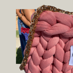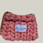 This mini chunky knit bag is handcrafted by Knowing with vibrant coral polyester yarn and finished with a luxe 18-karat gold plated chain shoulder strap for a touch of effortless glam. The rich texture and eye-catching color make it the perfect statement piece for day or night.